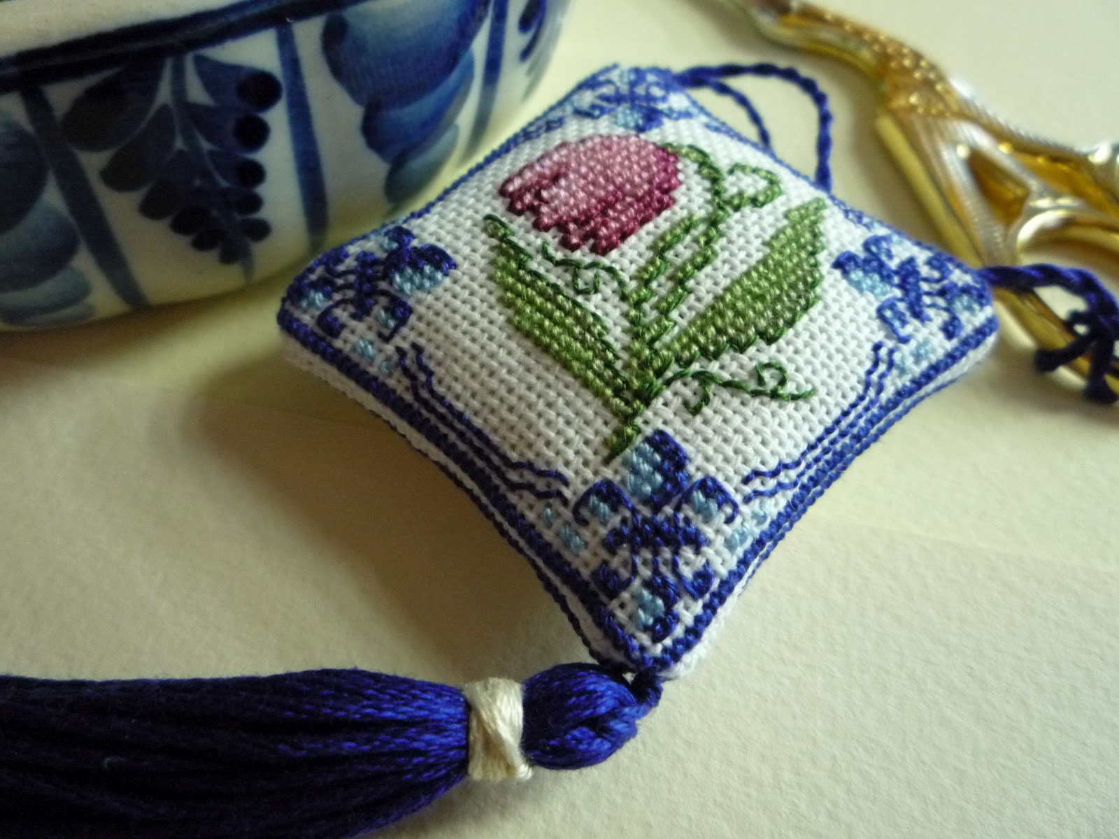And spring has already come. So I pulled myself together and made a spring scissor keep with a delft tulip, though the little flower resembles me fritillária.